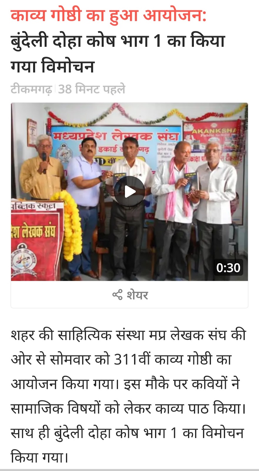 टीकमगढ़// दिनांक -3-8-2025 को नगर सर्वाधिक सक्रिय साहित्यिक संस्था म.प्र. लेखक संघ जिला इकाई टीकमगढ़ की 328वीं कवि गोष्ठी ‘आकांक्षा पब्लिक स्कूल टीकमगढ़’ में राष्ट्रकवि डाॅ.मैथिलीशरण गुप्त जंयती पर केन्द्रित आयोजित की गयी है।